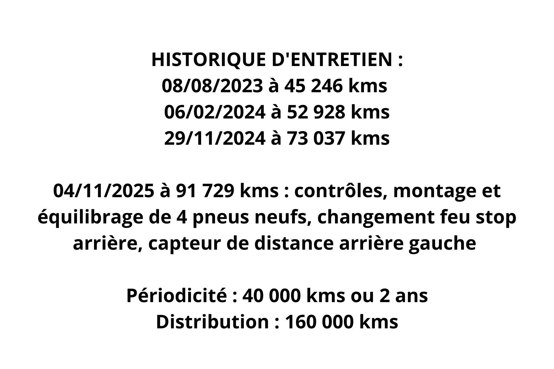04/11/2025 à 91 729 kms : contrôles, montage et équilibrage de 4 pneus neufs, changement feu stop arrière, capteur de distance arrière gauche