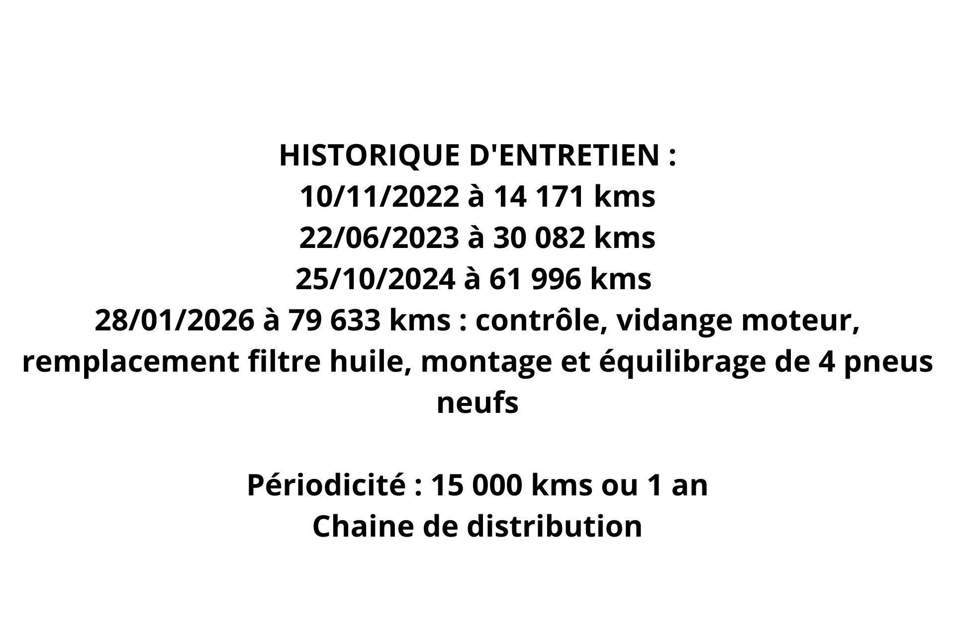 28/01/2026 à 79 633 kms : 92 points de contrôle, vidange moteur, remplacement filtre huile, montage et équilibrage de 4 pneus neufs