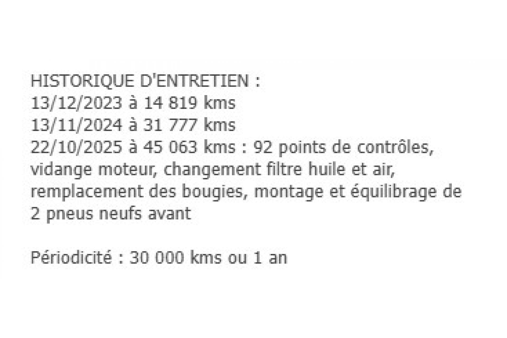 22/10/2025 à 45 063 kms : contrôles, vidange moteur, changement filtre huile et air, remplacement des bougies, montage et équilibrage de 2 pneus neufs avant